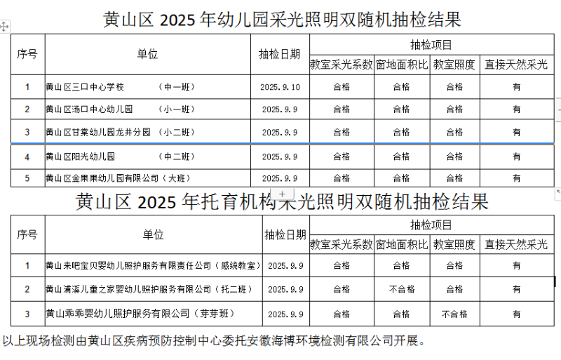 黄山区2025年幼儿园、托育机构采光照明双随机抽检结果