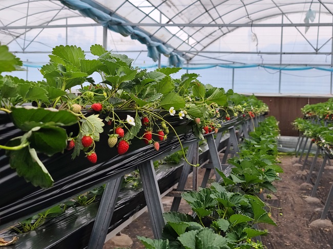高架草莓种植是这个基地的特点。与传统的种植方法不同,高架草莓种植在离地面一定高度的支架或栽培槽上,这一模式不仅大幅降低了工人采摘与日常管护的劳动强度,更从根源上破解了传统土壤种植中土传病虫害频发的难题,有效克服了盐碱土壤制约草莓养分吸收的瓶颈。