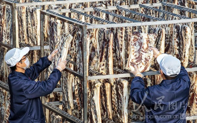 总说明:2026年1月8日,在安徽省黄山市黄山区全江生态农业科技有限公司的晒场上,工人利用晴好天气,忙着晾晒腌制后的徽州腊味,以供春节市场需求。 近年来,安徽省黄山市黄山区大力发展徽州腊味产业,将传统腌制晾晒后的腊肉、火腿、香肠等徽州腊味产品,通过“线上”和“线下”的销售方式,供应各地市场,同时有效带动了一大批村民在家门口就业创业,实现增收致富,助力乡村振兴。