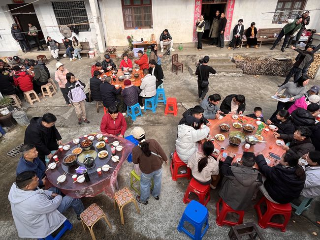 正午时分,一道道带着锅气的农家菜陆续上桌,土猪肉肥而不腻,时令鲜蔬清爽可口。素不相识的人们围坐一桌,酒杯轻碰间,家长里短与聂家山的红色往事交织,城市的喧嚣与生活的疲惫被抛在脑后,陌生的隔阂在推杯换盏中悄然消融。“这才是过年该有的样子!”一位网友放下筷子感慨,“每一口都是地道农家味,每一句话都透着真性情,心里暖烘烘的。”