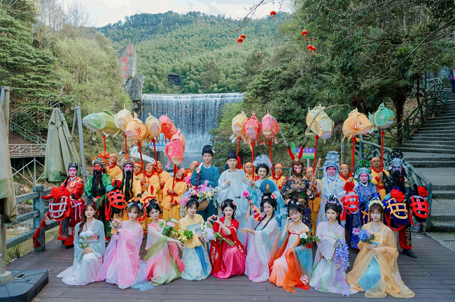 活动现场,国风文化体验成为最大亮点。国风十二花神与芙蓉谷全新IP芙蓉花神惊艳亮相,身着华服的花神NPC手持时令花卉,穿梭于青山碧潭间,与游客随机互动、合影打卡、趣味对诗,一步一景皆是国风画卷;芙蓉花神为游客点染寓意春日安康的芙蓉花钿,挑花郎以诗词会友赠送花系文创,让游客在自然山水中沉浸式感受传统文化的独特魅力。