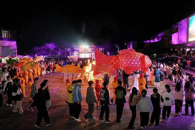 夜幕降临,芙蓉谷的春日浪漫持续升温。吉庆鱼灯、轩辕车会、跳竹马等黄山本地非遗项目轮番上演,流光溢彩的鱼灯巡游山水间,古朴民俗与现代夜游碰撞出别样火花;喷火表演、少数民族歌舞接连登场,将现场氛围不断推向高潮。花神巡游引导游客齐聚篝火场地,星空为幕、山水为景,游客围炉欢歌、互动祈福,尽享春夜的热烈与浪漫。与此同时,“太平夜宴”在芙蓉广场开席,黄山本地特色菜肴、户外烧烤、时令鲜食一应俱全,搭配轻柔的民谣弹唱,游客围坐而食,在夜色、山水与旋律中,感受春日宴饮的惬意,实现烟火与诗意的完美交融。