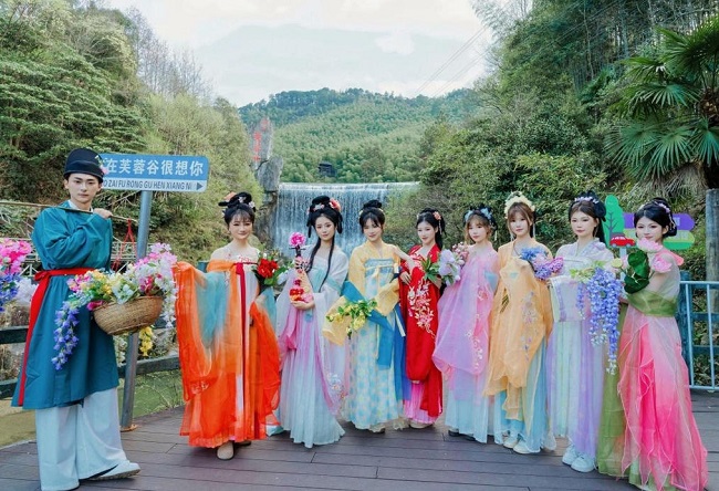 芙蓉谷景区内植被繁茂、有碧潭飞瀑,展现黄山北麓风光。活动现场,国风十二花神与芙蓉谷新IP芙蓉花神亮相。花神NPC身着华服、手持时令花卉,与游客互动、合影、对诗;芙蓉花神为游客点染芙蓉花钿。挑花郎在人群中以诗词互动,向游客赠送花系文创产品。