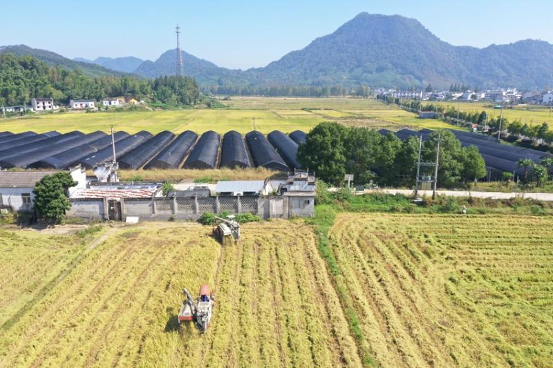 丰收时节的三口镇白果树村,稻田被阳光镀成流动的金箔。收割机碾过田埂,稻浪便成片俯首,谷粒瀑布般倾泻进粮仓,农民的欢笑与机器轰鸣混成奇妙的节拍。