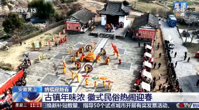 2月10日至11日,黄山区仙源镇非遗活动火热上演。10日,非遗巡街队伍沿仙源老街巡游,轩辕滚车、吉庆鱼灯、跳竹马、太平湖龙灯与居民游客擦肩互动,当晚登上央视《新闻联播》。11日南方小年,车公殿广场千人非遗互动,央视新闻频道《新闻直播间》面向全国直播。从古镇街头到央视荧屏,仙源镇让千年非遗“活”在当下,过了一个热气腾腾的中国年。
