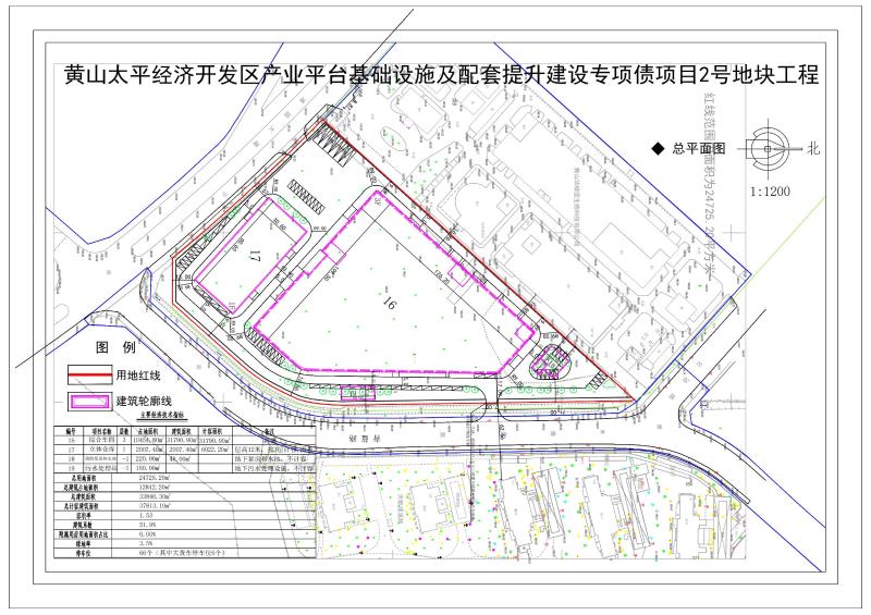 黄山太平经开区产业平台基础设施及配套提升建设项目2号地块位于太平经开区浦园大道与青蓝路交叉口处,建设单位为黄山区综合经济园区投资开发有限公司。项目用地性质为工业用地,用地面积约24725.20平方米,规划总建筑面积33846.30平方米,计容建筑面积37813.10平方米,容积率1.53,建筑系数51.9%,绿地率3.5%。