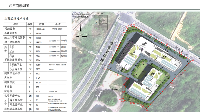 地块总用地面积13839.65㎡,用地性质为商业用地。本项目总建筑面积 23749 平方米(其中地下室3814平方米),计容建筑面积 19935平方米,容积率 1.45,建筑密度 37.04%,绿地率 20.1%,机动车停车位108 辆(含地下停车位76个)。