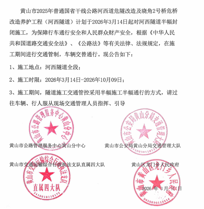 黄山市2025年普通国省干线公路河西道危隧改造及晓角2号桥危桥改造养护工程(河西隧道)施工公告