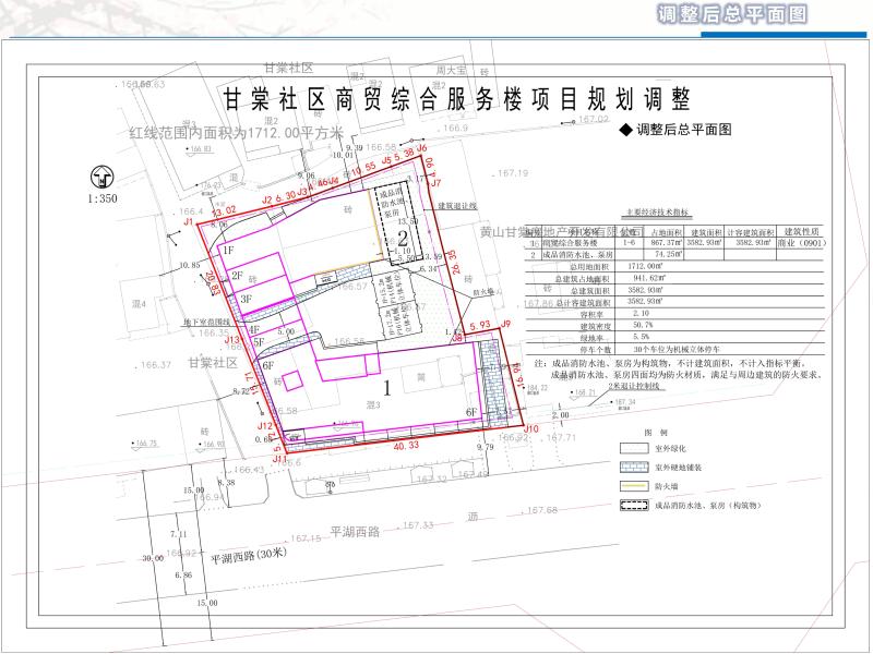 调整前总建筑面积:3904.77平方米,计容面积:3663.45平方米,容积率2.15,建筑密度55.4%,绿地率5.5%。调整后总建筑面积:3582.93平方米,计容面积:3582.93平方米,容积率2.1,建筑密度50.7%,绿地率5.5%。