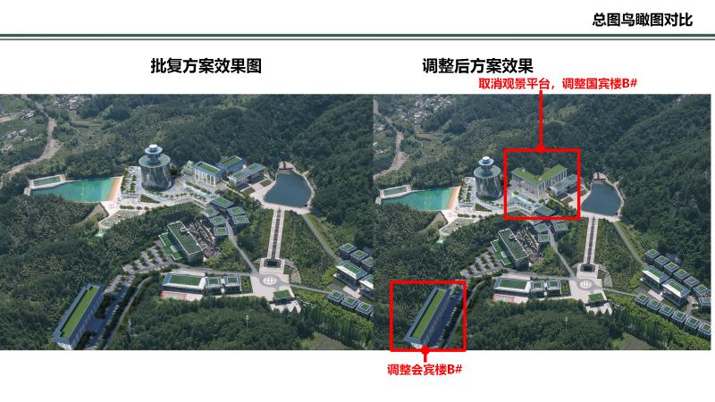 1、A地块:取消原观景平台,增加酒店(国宾楼B)规模并对内部功能进行局部优化。