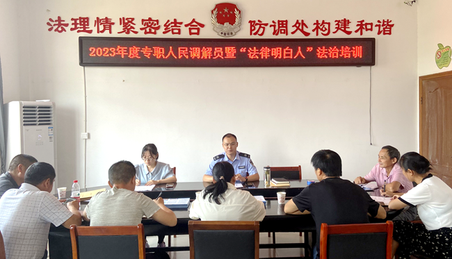 为深入学习贯彻党的二十大精神和习近平法治思想,进一步发挥专职人民调解员在法治宣传、法律服务、化解矛盾纠纷和参与基层社会治理中的示范引领作用,2023年8月8日,太平湖镇专职人民调解员暨“法律明白人”培训班(第一期)正式开班,来自太平湖镇和下辖7个村的9名专职人民调解员参加培训。