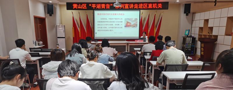 4月30日上午,黄山区“平湖青音”系列宣讲走进区直机关,来自黄山区委党校的青年宣讲员沈悦作《中国式现代化》专题宣讲报告。本次宣讲活动由区委组织部(区直机关工委)、区委宣传部、团区委等单位联合举办,结合机关青年“同心圆”计划——“青穗先锋”学习小组学习活动举行,来自区直有关单位的20余名青年干部聆听了宣讲报告。