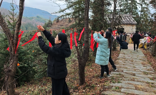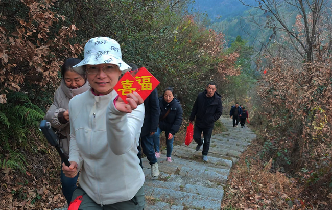 9时整,徒步活动正式开启。大家从苏氏宗祠广场出发,沿必吉岭古道向五福庙行进。沿途树木上悬挂着千余枚“福、禄、寿、喜、财”五种福字,参与者们兴致勃勃地寻找并收集福字,在徒步健身的同时,沉浸式体验“集福”乐趣。徒步终点,大家将提前书写好新年心愿的祈福带,系挂在必吉岭头古道两旁的枝头,祈求新的一年平安顺遂、福气盈门。同时,集齐五福的参与者凭福字兑换了精心准备的“福气礼包”,传递出浓浓的新年祝福。