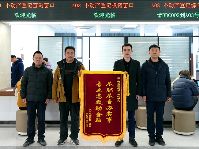 据悉,此次获赠锦旗源于企业一项时间紧、任务重的紧急需求。年末关头,正当企业面临税务核税系统即将关闭的倒计时压力时,区不动产登记中心主动对接企业需求,联合税务部门,开启绿色通道,组织业务骨干多晚加班加点,高效完成了涉及住宅、商铺、车位、厂房等不动产的转移、解押、解封等登记业务,为企业后续融资运作、产权管理提供了保障。