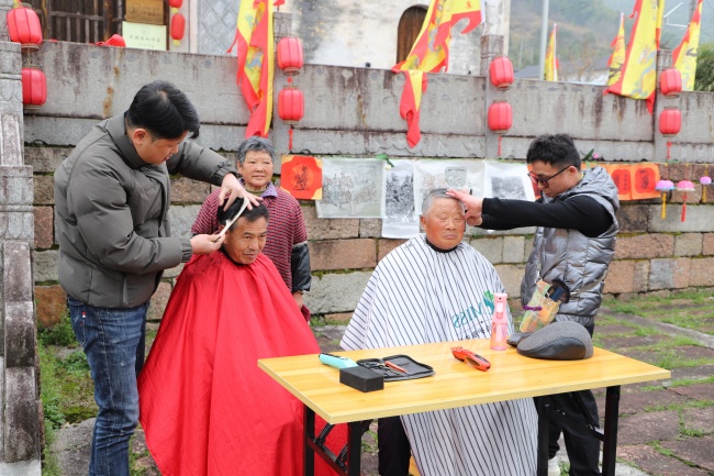 随着巡游开始,村民们在千年古树下通过挂心愿牌、系吉祥红绳等方式,寄托对风调雨顺、家宅安康的美好期盼;程氏宗祠前开设免费义剪专区,优先为老人、儿童服务,以“剃龙头”的传统习俗,传递鸿运当头的吉祥寓意。活动现场还设置田间市集与非遗体验区,汇聚“魁蛋”、艾叶粿等乡土美食,开展徽州板画拓印、河灯制作、亲子舞龙DIY等体验活动,让群众近距离感受民俗文化与非遗技艺的魅力。