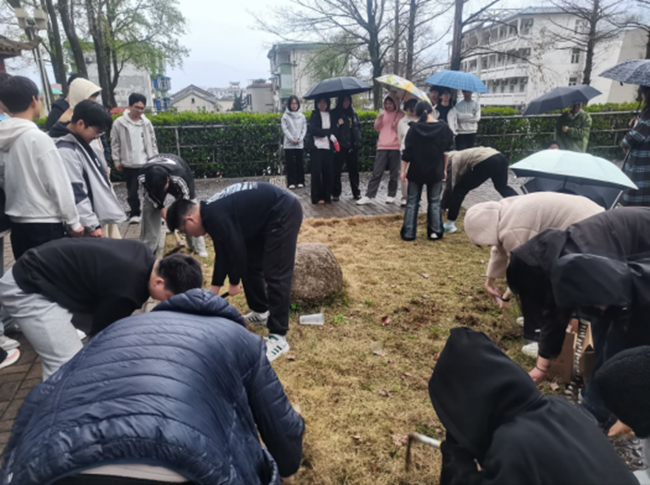 活动当天,细雨绵绵,但学生们的热情丝毫未减。平日里埋头于题海的少年们放下纸笔,手持农具,化身校园里的“小小播种者”。他们在空地上松土、挖坑,亲手种下一粒粒向日葵种子。整个过程井然有序,学生们在劳作中体验农耕文化,也在泥土与汗水之间种下属于自己的青春约定。