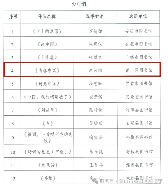 本届大赛共收到参赛作品1222件,赛程经过初赛、复赛多轮选拔,并由专家严格评审,最终仅有24个优秀作品晋级现场决赛(其中成年组、少年组各12个)。黄山区图书馆推送的作品《青春中国》(李沐阳)脱颖而出,成功占得一席,也成为黄山市唯一晋级决赛的代表!