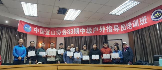 培训后期以 “理论考核 + 实践考核” 双重检验学习成果,学员需独立完成户外方案策划、实战技能操作等考核内容。最终,全员完成培训,顺利结业,获颁中国登山协会中级山地户外指导员培训结业证明。