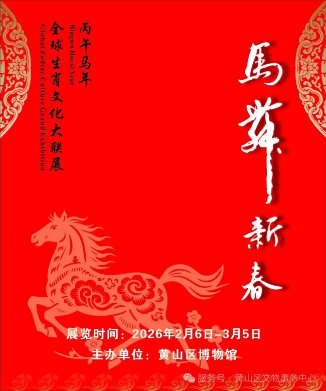 辞旧岁灵蛇辞岁去,迎新春骏马踏春来。在2026年丙午马年春节来临之际,为丰富市民游客新春文化生活,传承弘扬中华生肖文化与马文化精髓,黄山区博物馆精心筹备的《马舞新春—丙午马年全球生肖文化大联展》正式启幕,以“马为媒、文为魂”,串联起跨越时空、融汇中外的生肖文化脉络,为新春佳节注入浓厚的文化气息。