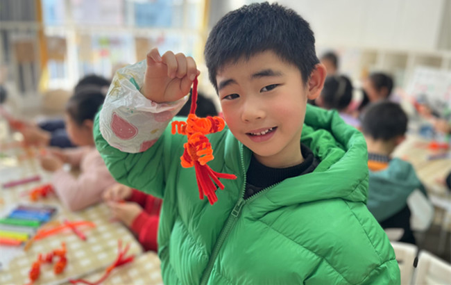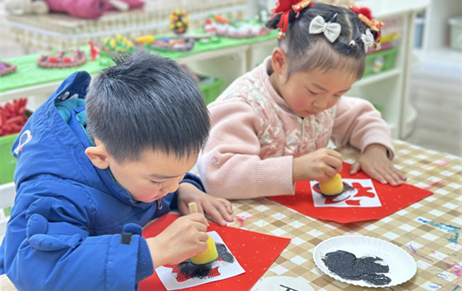 走进各个班级,迎新活动如火如荼地开展着。孩子们有的印下五彩手印创作年俗画;有的扎染出“一抹中国红”并制成红包传递祝福;有的用扭扭棒编织出中国风挂件和鞭炮;还有的画春联、福字,笔墨间倾注新春祝愿。