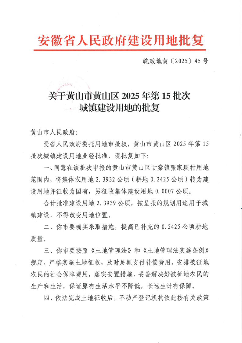 关于黄山市黄山区2025年第15批次城镇建设用地的批复