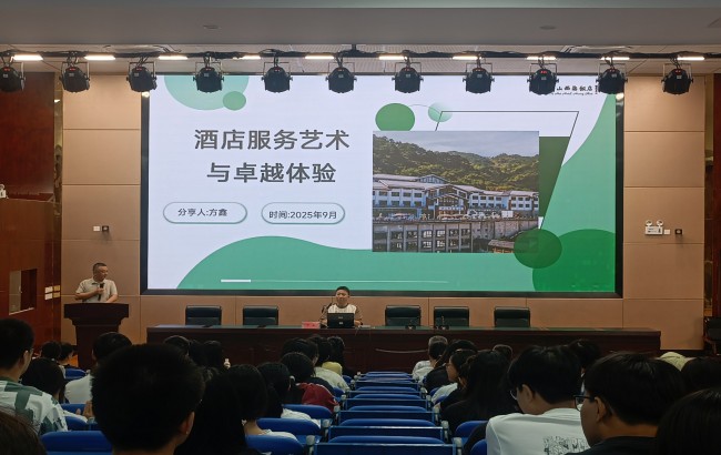 随后,市劳动模范、酒店行业资深管理者方鑫老师以“酒店服务艺术与卓越体验”为主题进行分享。他从现代酒店服务的本质入手,层层剖析如何通过极致服务打造令人难忘的宾客体验。每一个步骤,他都通过真实生动的案例加以阐释,逻辑清晰,内容充实,赢得了师生们的阵阵掌声。