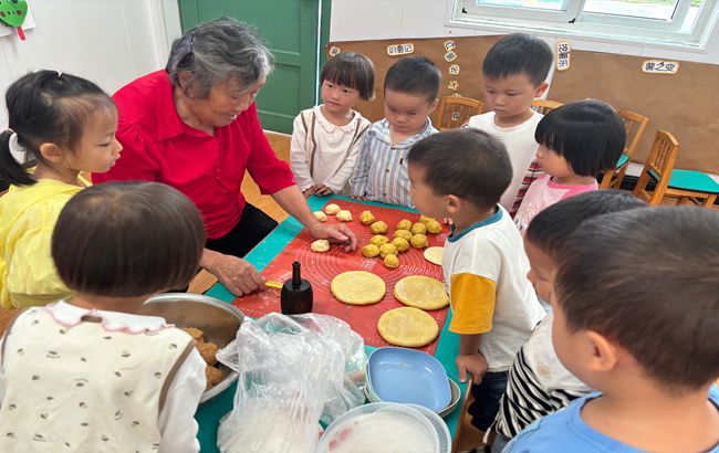 活动伊始,老师向孩子们介绍了中秋节的传统习俗。随后,心灵手巧的家长闪亮登场,她作为本次活动的“特邀老师”,向孩子们展示了制作永丰月饼的传统技艺。奶奶耐心细致地讲解着揉面、拌馅、包饼等每一个步骤,并用生动的家乡话分享着永丰月饼背后的故事和寓意。
