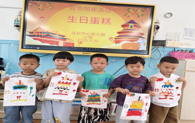 小班组的孩子们拿起画笔,在“生日蛋糕”模板上尽情涂色,他们用鲜艳的红色、明亮的黄色、温暖的橙色,勾勒出心中最甜美的蛋糕,每一笔色彩都承载着对祖国妈妈的祝福;中班组的孩子们则动手制作“爱心国旗”,他们仔细粘贴五角星,用心折叠红色卡纸,当一面面小巧精致的爱心国旗在手中完成时,孩子们脸上露出了自豪的笑容;大班组的哥哥姐姐们展开想象的翅膀,围绕“双节同庆”主题进行自由创画,每一幅作品都是孩子们对祖国和传统节日最真挚的表达。