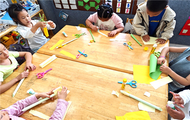 “现在,我们一起来做一束‘稻穗’,把丰收的快乐留下来吧!”孩子们互帮互助,有的孩子撕皱纹纸速度慢,身边的小伙伴就主动分享自己剪好的材料;有的孩子不知道如何固定黏土,老师则耐心示范,手把手指导。当一束束形态各异的“手工稻穗”完成后,孩子们将它们插在教室的“丰收角”,整个教室仿佛变成了一片小小的“稻田”。