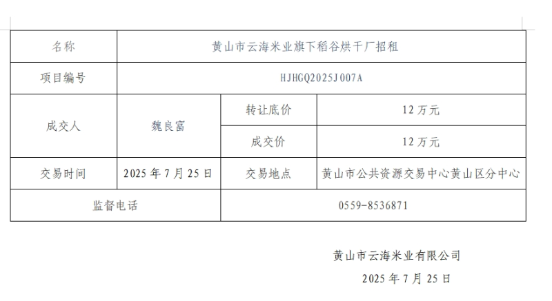 黄山市云海米业旗下稻谷烘干厂招租履约信息