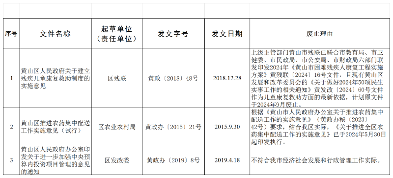 黄山区人民政府2024年废止、失效类行政规范性文件目录