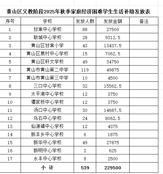 黄山区义教阶段2025年秋季家庭经济困难学生生活补助发放情况