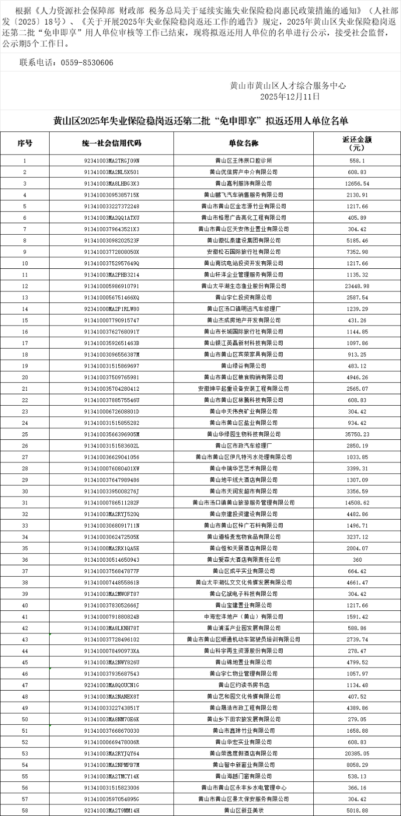 2025年黄山区失业保险稳岗返还第二批“免申即享”拟返还用人单位名单的公示