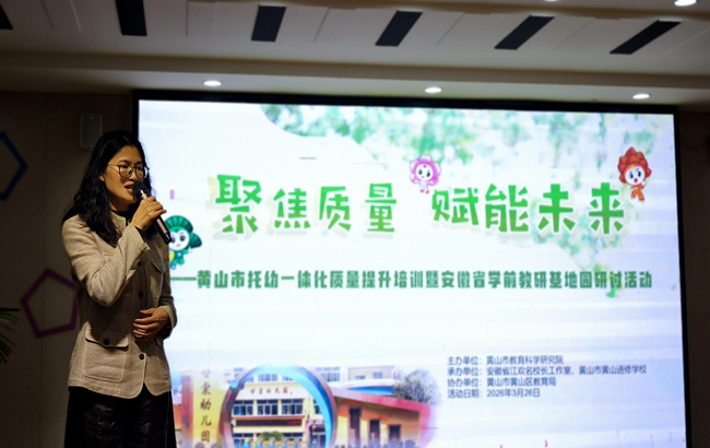 为深化托幼一体化教育发展,发挥省级学前教研基地园示范辐射作用,3月25日至26日,黄山市托幼一体化质量提升培训暨安徽省学前教研基地园研讨活动在黄山区甘棠幼儿园顺利开展。本次活动以“聚焦质量 赋能未来”为主题,特邀专家、各教研基地园负责人、各区县教研员及省市级一类园园长等齐聚一堂,共研学前教育发展新路径。