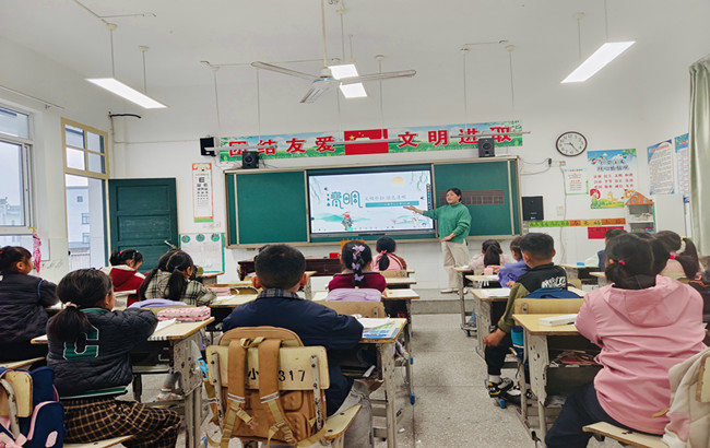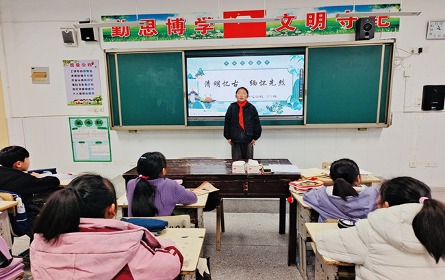 在升旗仪式上,国旗下的讲话向全校师生发出传承英烈精神的倡议,引导师生铭记先烈事迹,勇担时代使命。同时学校立足学段特点分层开展育人活动,一、二年级以主题班队会为载体,融合清明民俗知识与本土英烈故事,在低年级学子心中播下崇敬英雄的种子;三、四年级举办诗词会,队员们以多样形式诵读经典,让传统文韵与红色情怀交融浸润,让清明文化在校园落地生根。