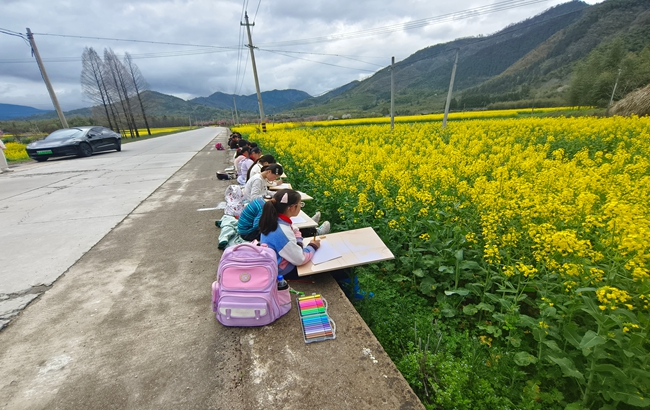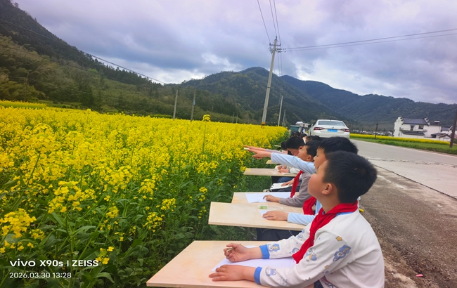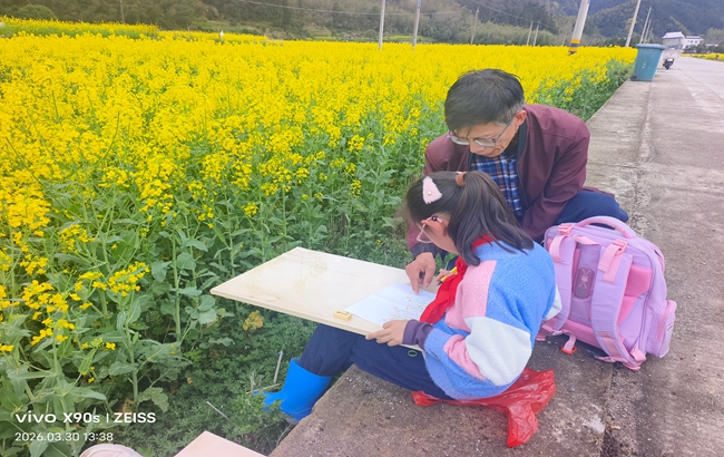 春风送暖,油菜花海金浪翻滚。祭扫活动结束后,在“家乡的油菜花”田野思政课堂上,老师们带领学生走进田间地头,一边讲解油菜的生长习性、农业生产知识,一边引导学生观察家乡的自然风光,感受乡村振兴带来的喜人变化。学生们化身“小小观察员”,用画笔勾勒花海美景,用文字记录家乡发展,在沉浸式体验中领悟“绿水青山就是金山银山”的深刻内涵,激发对家乡的热爱之情。