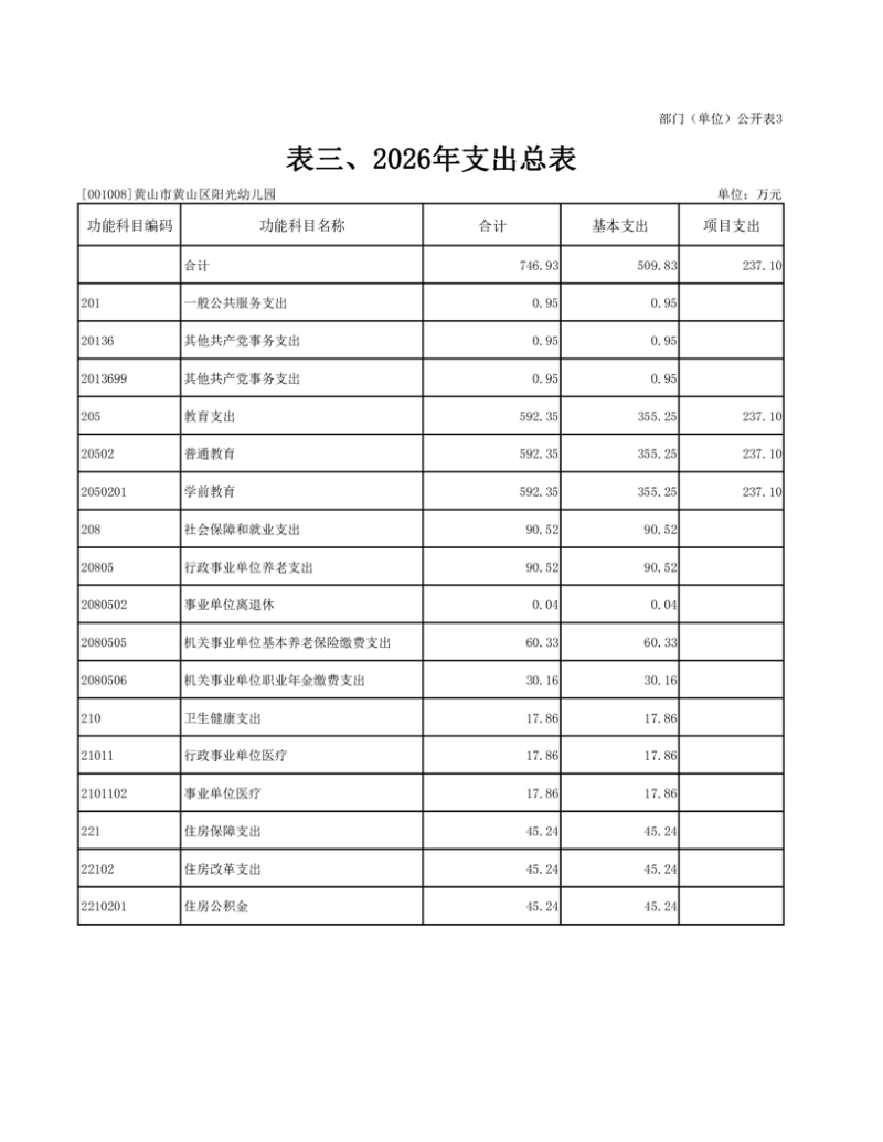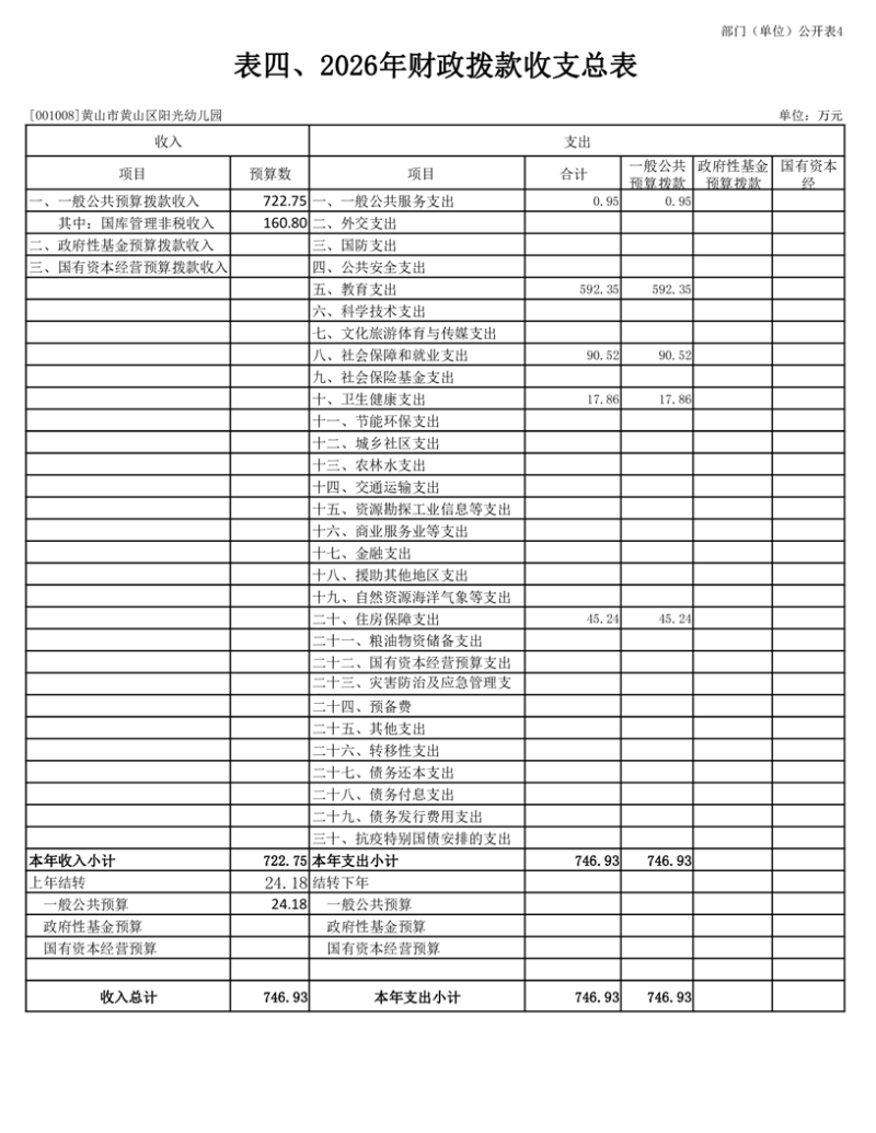 4.黄山区阳光幼儿园2026年财政拨款收支预算总表