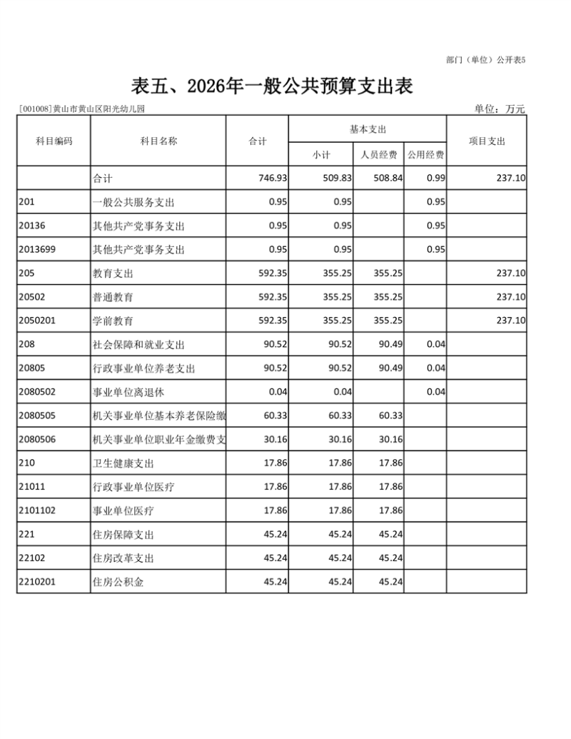 5.黄山区阳光幼儿园2026年一般公共预算支出表