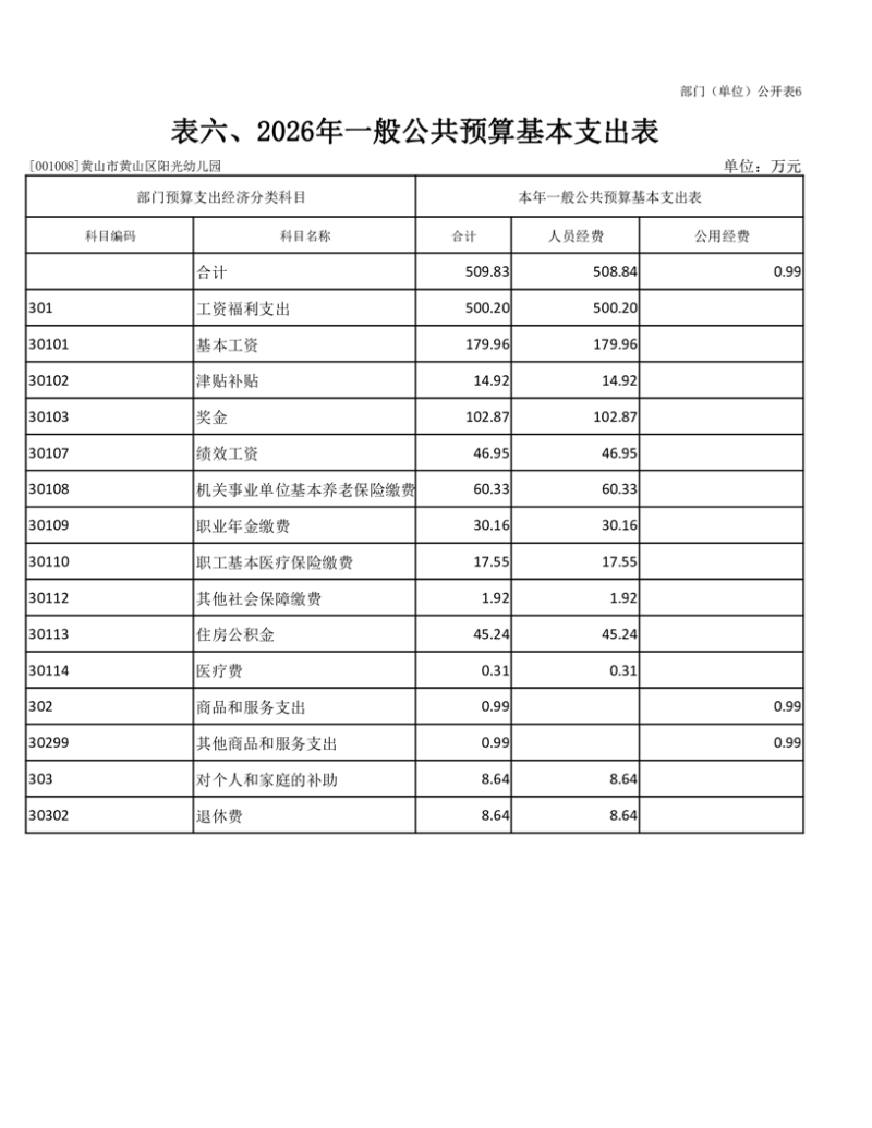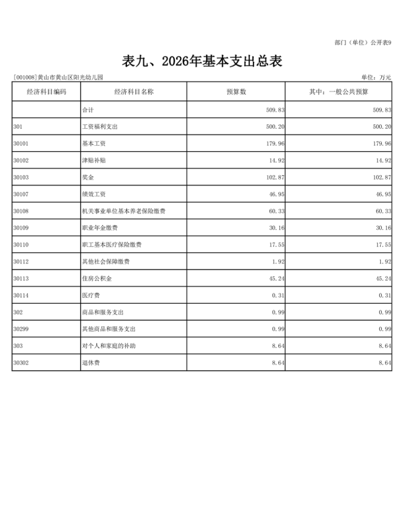 黄山区阳光幼儿园2026年一般公共预算基本支出509.83万元,其中:人员经费508.84万元,公用经费0.99万元。