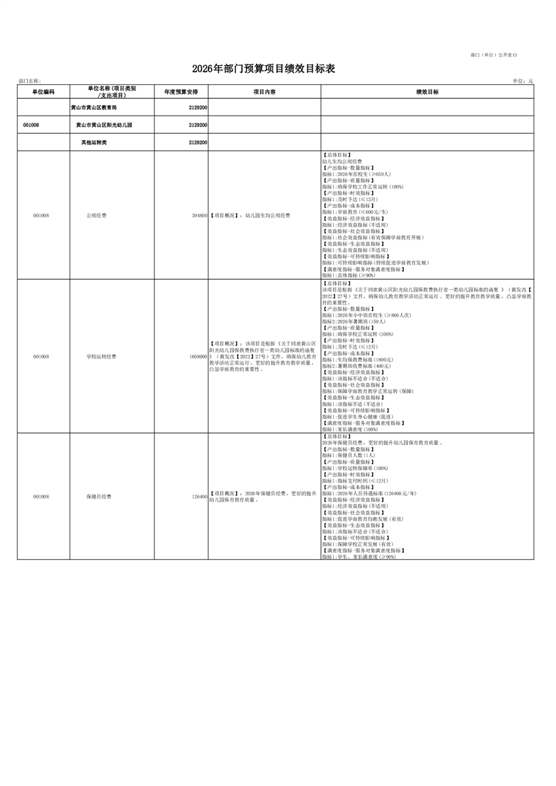 13.黄山区阳光幼儿园2026年项目支出绩效目标及项目情况表