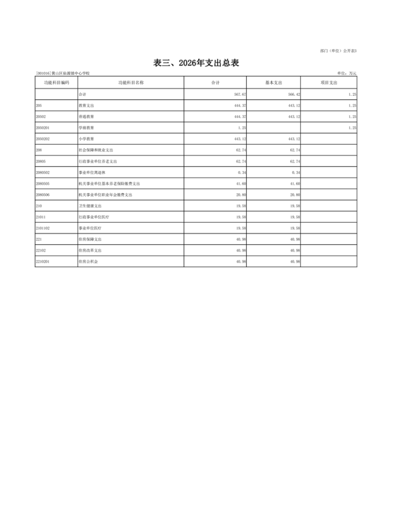 3.黄山区仙源镇中心学校2026年支出预算总表