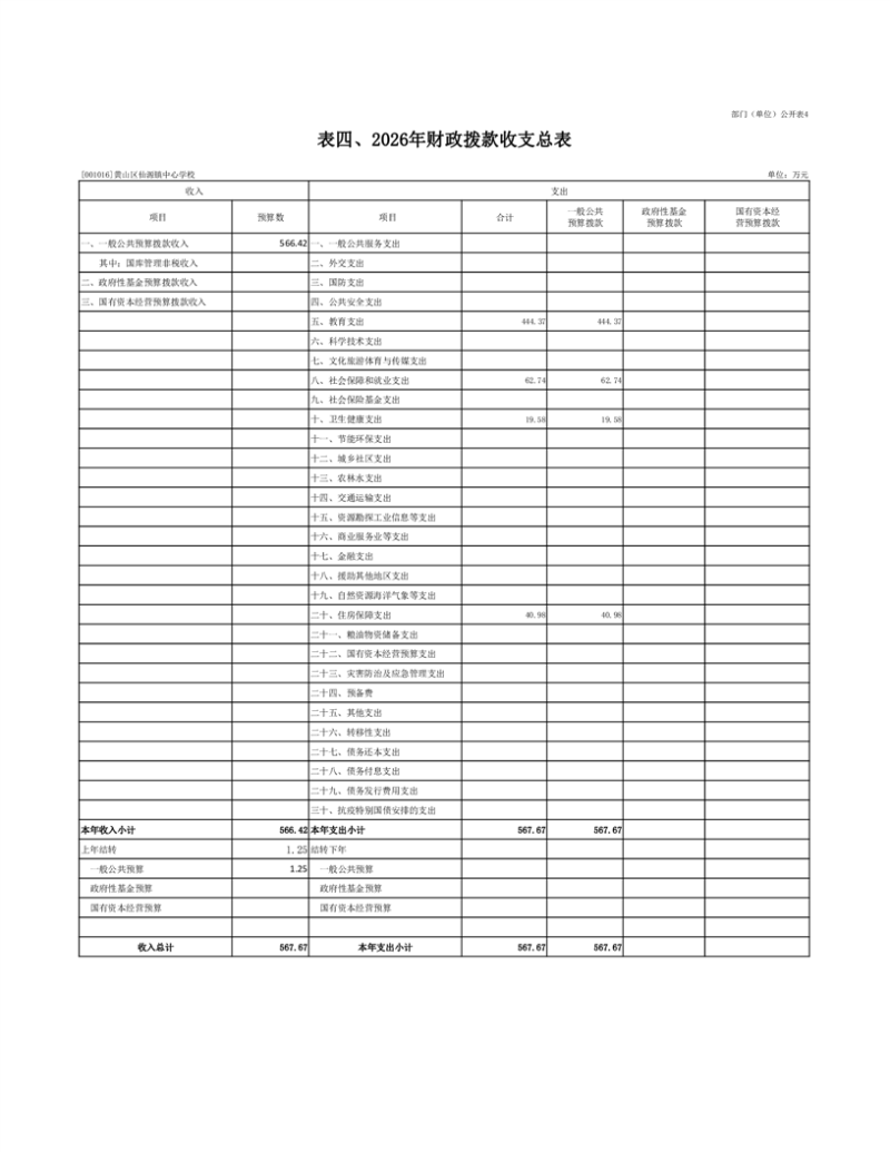 4.黄山区仙源镇中心学校2026年财政拨款收支预算总表