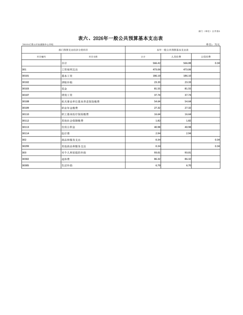 黄山区仙源镇中心学校2026年一般公共预算基本支出566.42万元,其中,人员经费566.08万元,公用经费0.34万元。
