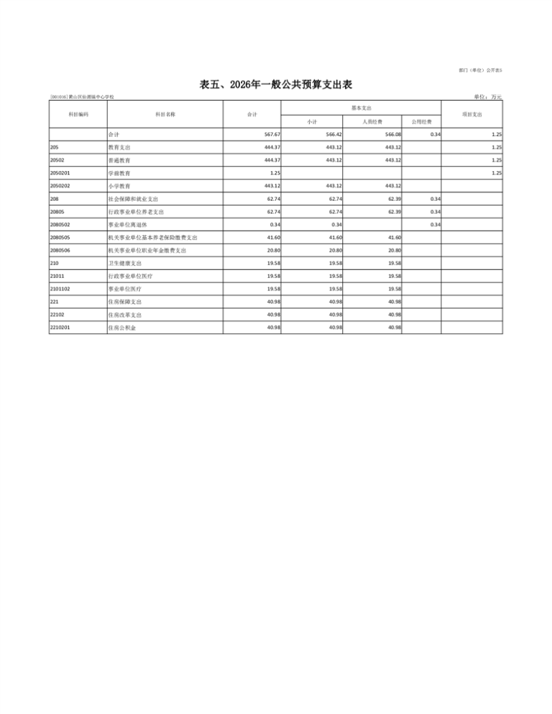 5.黄山区仙源镇中心学校2026年一般公共预算支出表