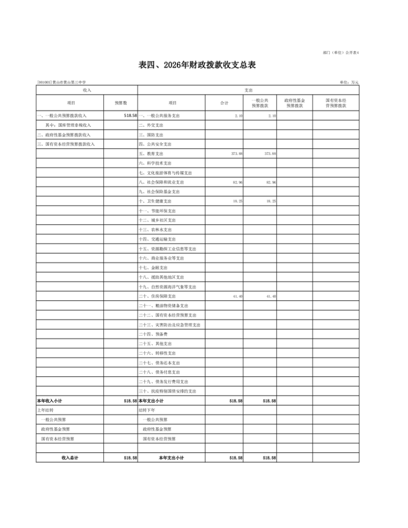 4.黄山市黄山第三中学2026年财政拨款收支预算总表