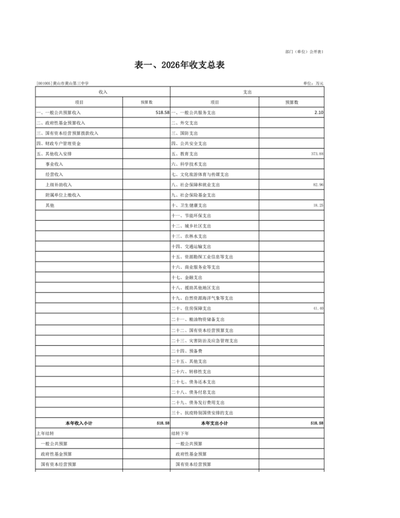 1.黄山市黄山第三中学2026年收支预算总表