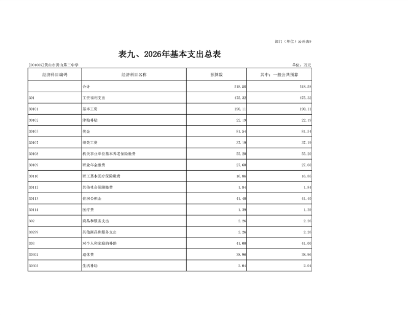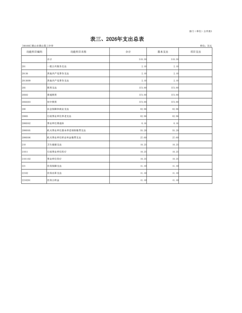 黄山市黄山第三中学2026年一般公共预算基本支出518.58万元,其中: