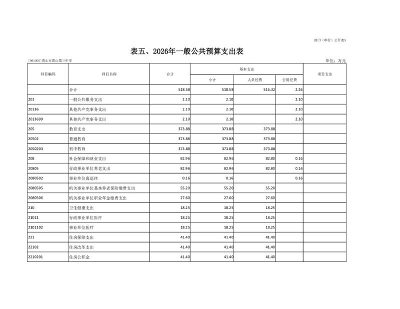 5.黄山市黄山第三中学2026年一般公共预算支出表