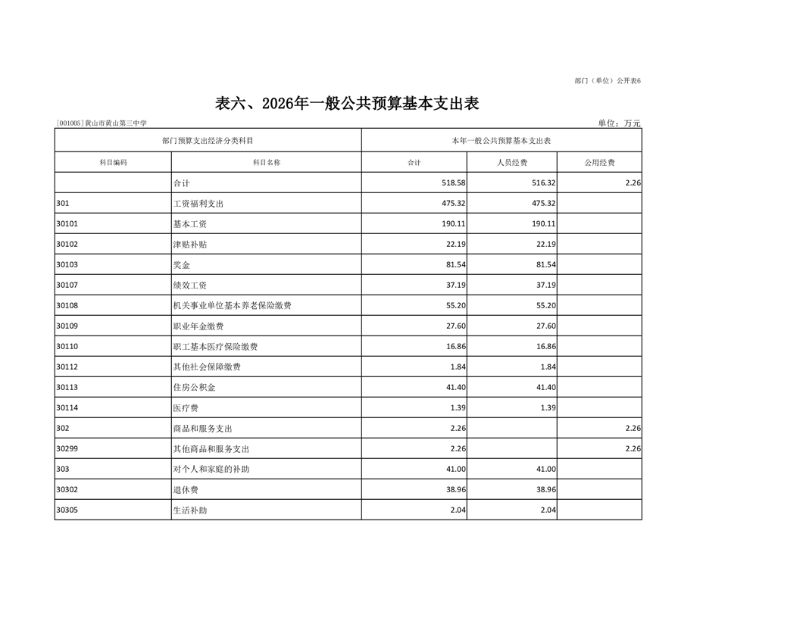 6.黄山市黄山第三中学2026年一般公共预算基本支出表