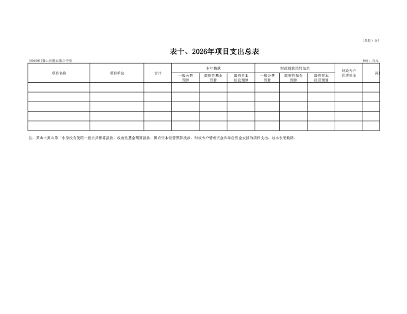 黄山市黄山第三中学2026年没有使用一般公共预算拨款、政府性基金预算拨款、国有资本经营预算拨款、财政专户管理资金和单位资金安排的项目支出。